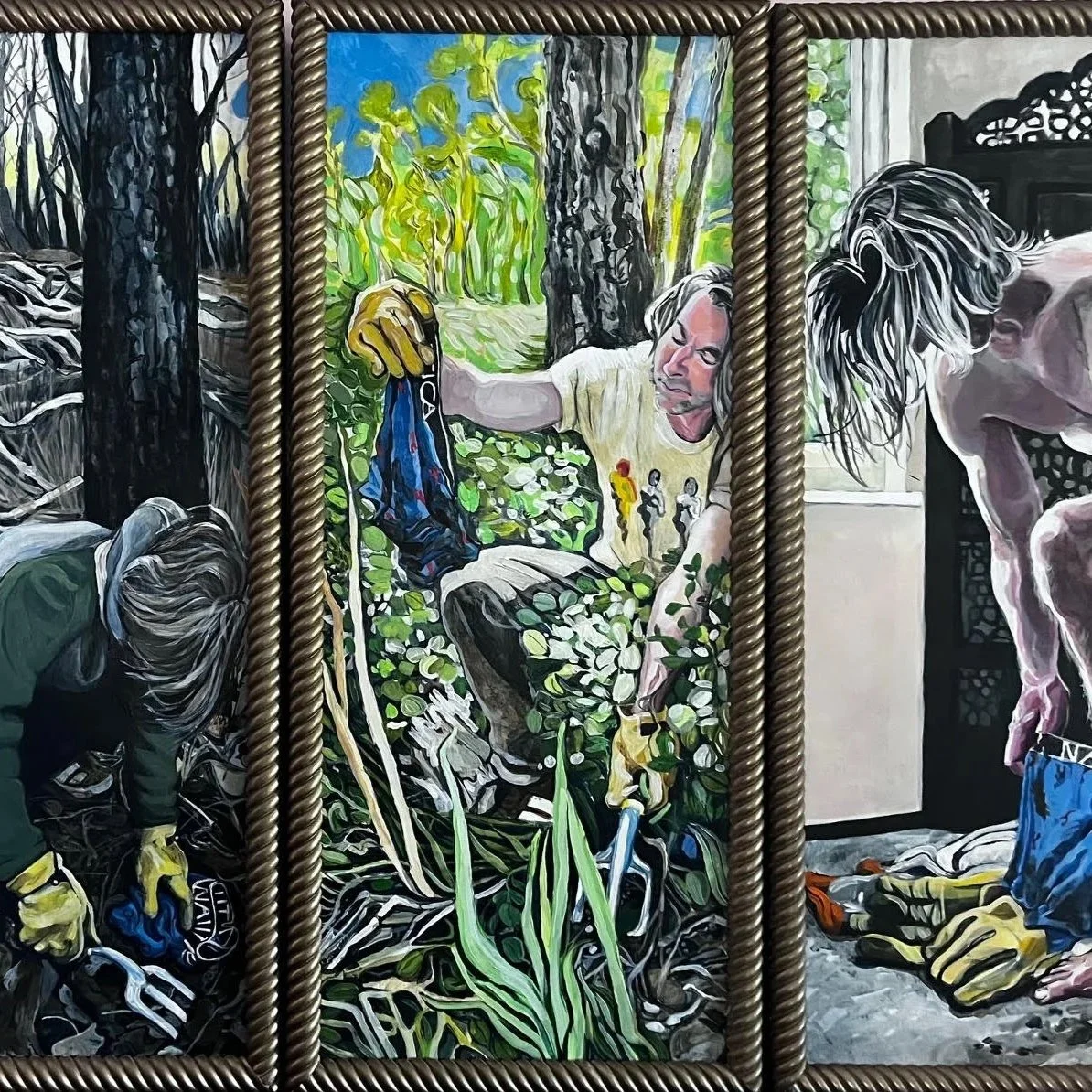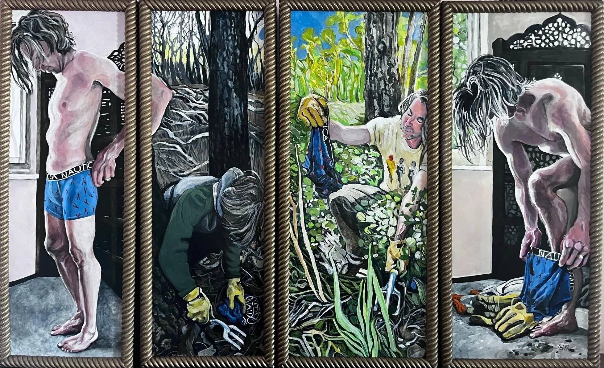 Seasonal change, decay, and biodegradation are front and center in the ancient story of Jeremiah. In the Jewish scriptures, Jeremiah is directed by God to create an experiment that requires time, the seasons, and clothing. By buying, wearing, burying, digging up, and wearing again a “loincloth” Jeremiah acts out his own ancient performance art, with God as the art director. My painting represents a modern depiction of this ancient story found in Jeremiah Chapter 13.